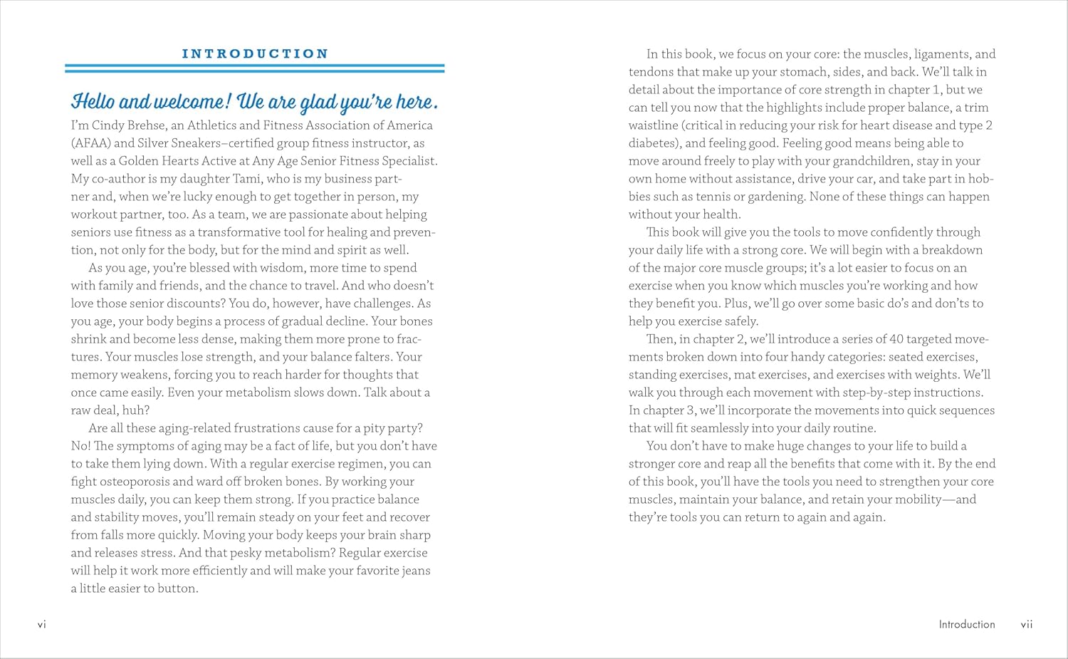 Get to know your core―Learn the muscle groups that make up your core, the benefits of keeping them strong, the importance of breathing and stretching, and the latest science behind exercise for seniors.Enjoy a wide variety of exercises―Discover a range of seated, standing, on-the-mat, and weighted exercises that mimic everyday movement and don’t require any special equipment.Follow step-by-step instructions―Find how-tos and illustrations for engaging the right muscles and preventing injury, as well as tips to increase or decrease the intensity of each movement to meet your needs.
